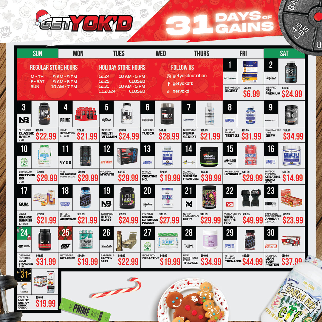 Join us for a month-long celebration of gains, discounts, and the best in sports nutrition. It's time to GET YOK'D and make your holi-gains count! 🎄