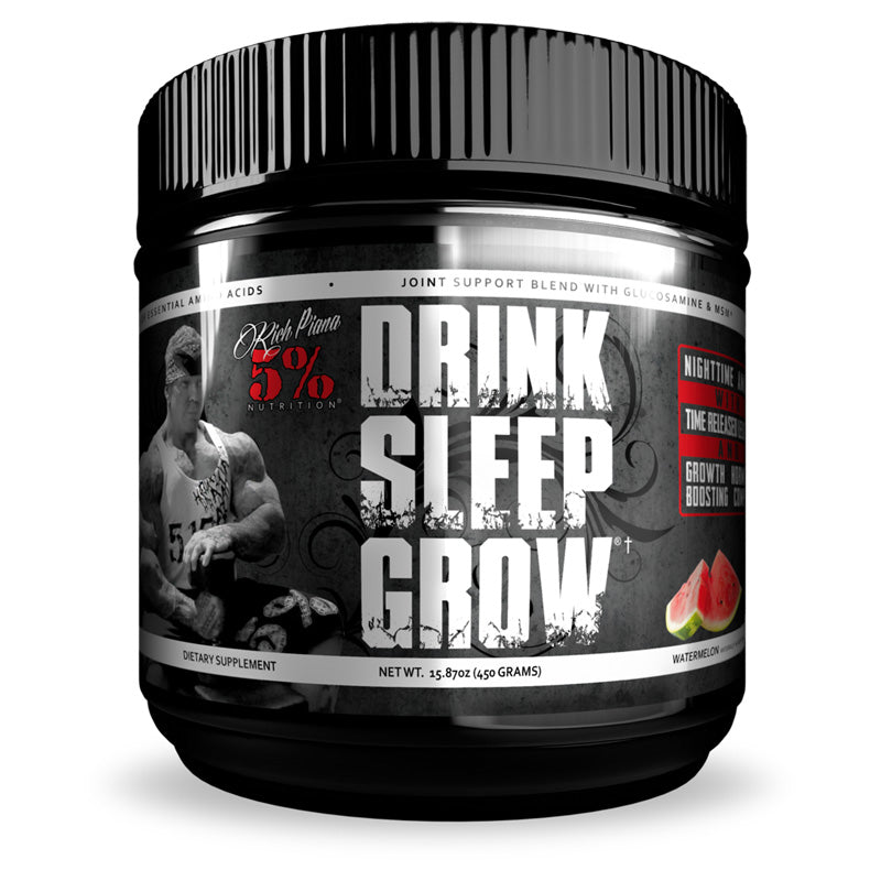Rich Piana 5% Nutrition Drink Sleep Grow® is a combination of EAAs, CEAAs, and BCAAs featuring the revolutionary Active TR™ L-Leucine along with GH Releasers and a special Joint Support Blend that creates a powerful nighttime recovery formula unlike anything else on the market.