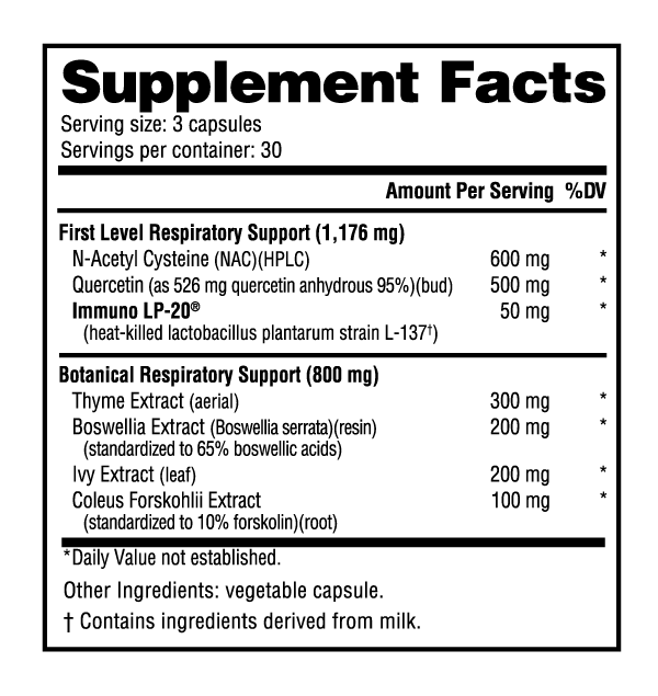 Lungs is a respiratory support formula for optimal lung health. The main ingredient is Immuno-LP20 (Lactobacillus Plantarum): Lactic-acid bacteria commonly found in a wide variety of fermented foods. It also includes supporting ingredients NAC, Quercetin, Thyme Extract, Boswellia Extract, Ivy Extract & Coleus Forskohli.