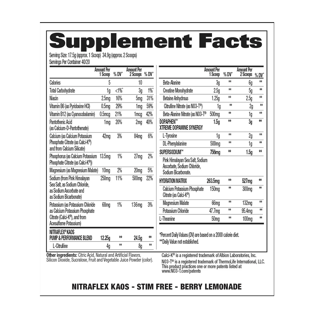 We all like having choices, and Nitraflex Kaos Stim-Free provides you with many. Whether you prefer a stimulant-free pre-workout or want the ability to stack it with another product that contains them, you have the freedom and flexibility to do so. While Nitraflex Kaos Stim-Free doesn’t contain caffeine, this formula still packs a powerful punch. With the ability to heighten your mind-muscle connection, improve strength, intensify muscle pumps, and support hydration, Nitraflex Kaos Stim-Free can help maximize your workouts and results.