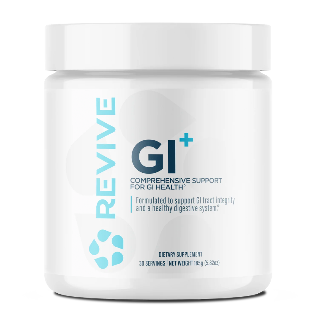 Revive Supplements GI+ is a natural supplement designed to support digestive health by aiding gut lining integrity and supporting a healthy gut microbiome. This formula contains prebiotics that can help restore and maintain a healthy balance of gut bacteria.