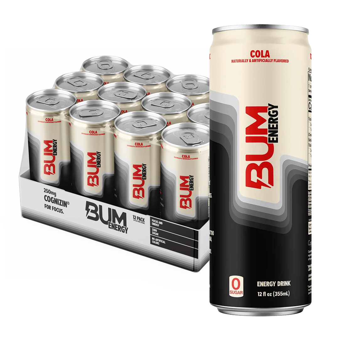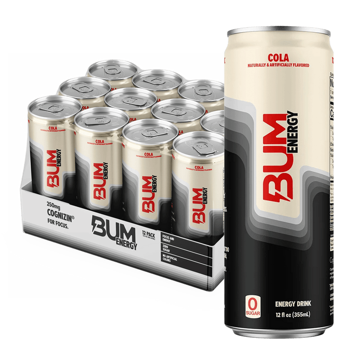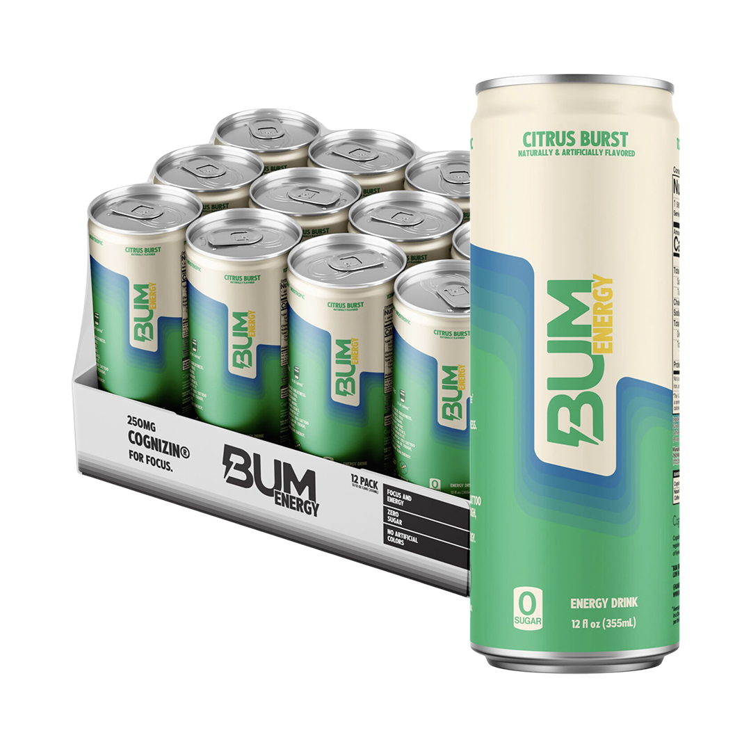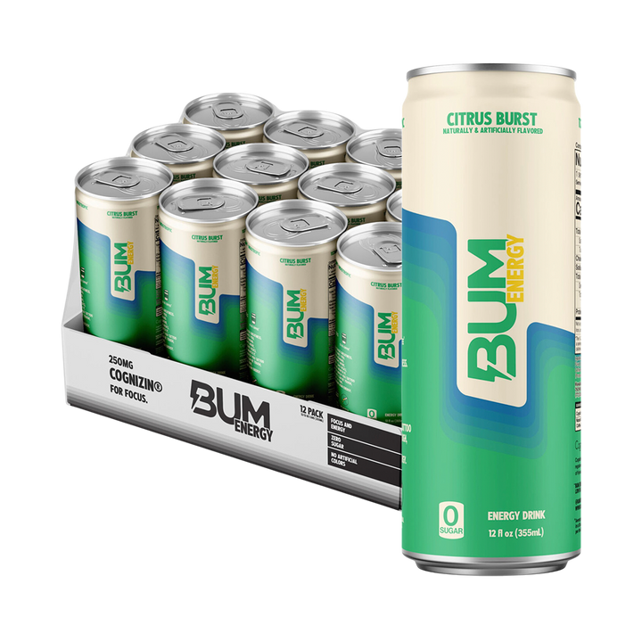 CBUM BUM Energy is Chris Bumstead's new Energy Drink which features contains a moderate 112mg of caffeine, slightly more than a cup of coffee which allows you to consume a couple cans per day without going over your daily caffeine alotment. This tasty energy drink aslo features 250mg of Cognizin branded Citicoline, zero sugar, no artificial flavors and with just 5 calories per can.