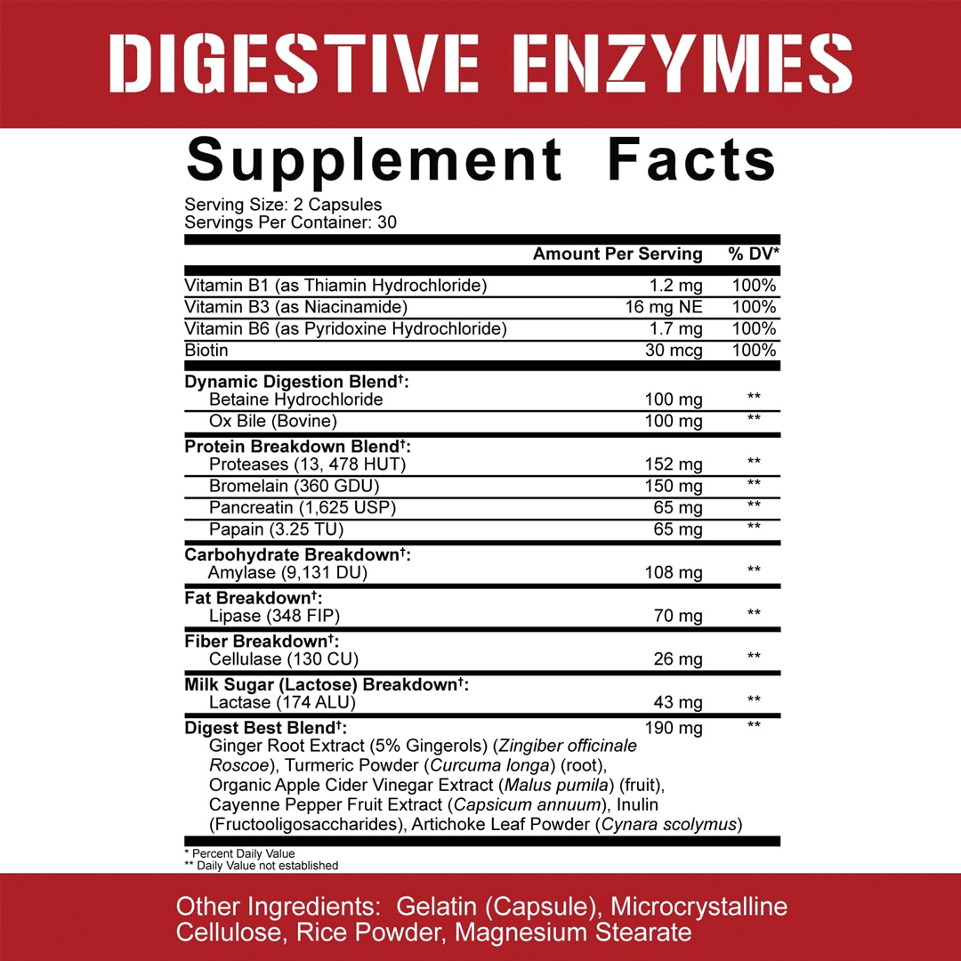 Do you want to achieve the goals you’re working hard for? No doubt you’re eating a carefully calculated balance of protein, carbohydrates, and fats to optimize your macronutrients while training. You'll have to improve your digestion to maximize the benefits of your diet, supplements, and training. This outstanding product is a full-spectrum digestive enzyme complex. Digestive Enzymes features full disclosure labeling and exceptional dosing.