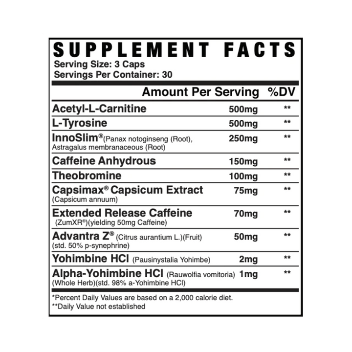 FYRED V2 IS LOADED WITH FOUR TRADEMARKED INGREDIENTS, INCLUDING INNOSLIM®, CAPSIMAX®, ZÜMXR®, AND ADVANTRAZ®, AT THEIR OPTIMAL DOSES. EVERY SERVING CONTAINS 200 MILIGRAMS OF CAFFEINE COMING FROM A COMBINATION OF FAST-ACTING AND DELAYED RELEASE SOURCES.