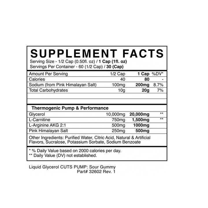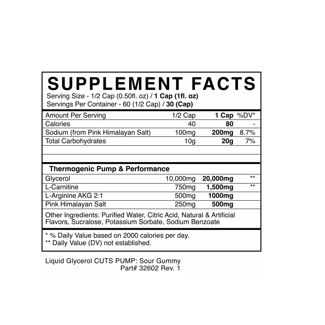 CUTS PUMP is a powerful, caffeine-free, liquid glycerol shot with added L-carnitine. It helps boost metabolism, enhance endurance, and maximize muscle hydration and volume. Perfect on its own or stacked with any of our pre-workouts.