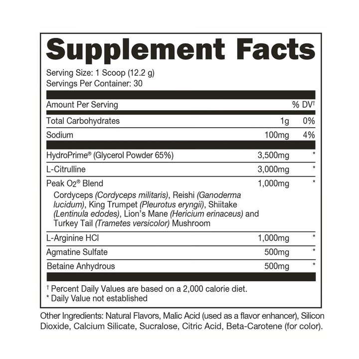 Most pump products work only on improving your pump -- surprise. Not us. We want more. We’re insatiable. You should be too. We add in PeakO2, which has been shown to increase power output over time.
