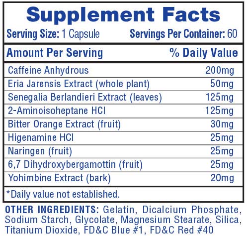 INDIVIDUALS WHO CONSUME CAFFEINE WITH THIS PRODUCT MAY EXPERIENCE SERIOUS ADVERSE HEALTH EFFECTS. INDIVIDUALS WHO ARE SENSITIVE TO THE EFFECTS OF CAFFEINE SHOULD CONSULT A LICENSED HEALTH CARE PROFESSIONAL BEFORE CONSUMING THIS PRODUCT. DO NOT CONSUME SYNEPHRINE OR CAFFEINE FROM OTHER SOURCES, INCLUDING BUT NOT LIMITED TO, COFFEE, TEA, SODA OR OTHER DIETARY PRODUCTS OR MEDICATIONS CONTAINING CAFFEINE OR PHENYLEPHRINE. DO NOT USE FOR MORE THAN 8 WEEKS. CONSULT WITH YOUR PHYSICIAN PRIOR TO USE IF YOU ARE TAKING MEDICATION, INCLUDING BUT NOT LIMITED TO MAOI INHIBITORS, ASPIRIN, ANTIDEPRESSANTS, NON-STEROIDAL ANTI-INFLAMMATORY DRUGS OR PRODUCTS CONTAINING PHENYLEPHRINE, EPHEDRINE, PSEUDO-EPHEDRINE, OR OTHER STIMULANTS. CONSULT YOUR PHYSICIAN PRIOR TO USE IF YOU HAVE A MEDICAL CONDITION, INCLUDING BUT NOT LIMITED TO, HEART, LIVER, KIDNEY, OR THYROID DISEASE, PSYCHIATRIC OR EPILEPTIC DISORDERS, DIFFICULTY URINATING, DIABETES, HIGH BLOOD PRESSURE, CARDIAC ARRHYTHMIA, RECURRENT HEADACHES, ENLARGED PROSTATE OR GLAUCOMA. DISCONTINUE 2 WEEKS PRIOR TO SURGERY OR IF YOU EXPERIENCE RAPID HEART BEAT, DIZZINESS, SEVERE HEADACHE OR SHORTNESS OF BREATH. IN CASE OF ACCIDENTAL OVERDOSE, SEEK PROFESSIONAL ASSISTANCE OR CONTACT A POISON CONTROL CENTER IMMEDIATELY. AVOID ALCOHOL WHILE TAKING THIS PRODUCT. EXCEEDING RECOMMENDED SERVING MAY CAUSE SERIOUS ADVERSE HEALTH EFFECTS, INCLUDING HEART ATTACK AND STROKE. IMPROPER USE OF THIS PRODUCT MAY BE HAZARDOUS TO A PERSON’S HEALTH.
