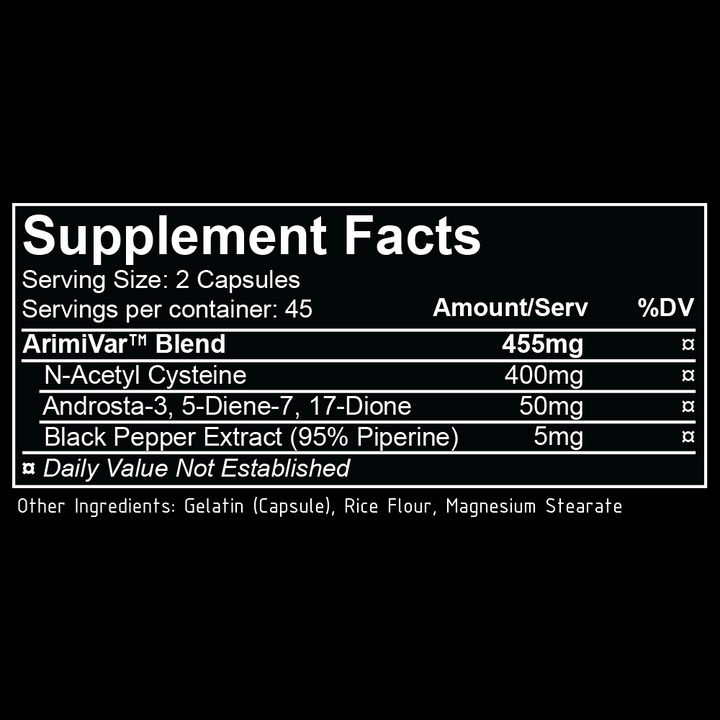 CAUTION: ArmiVar is a potent aromatase inhibitor. This product is intended for healthy athletes aged 21 years or older. REPP Sports recommends using ArmiVar in conjunction with blood tests to monitor hormonal impact. Consult your primary care physician if you're currently taking medication that may interact with ArmiVar. DISCLAIMER: Consult your doctor prior to use, especially if you are taking any medications and have, or are at risk for prostate disease, heart disease, or other medical conditions. Do not exceed suggested dosage. Discontinue use immediately if you experience rapid heart beat, dizziness, vomiting or other similar symptoms. Side effects may include acne, hair loss, or increased aggressiveness. All persons are advised to consult with their doctor or other medical authority before use of this or any other dietary supplement. Do not use product if your health status is unknown. All persons are advised to contact their drug testing organization prior to use of this or any other dietary supplement. Not suitable for persons under the age of 21 years. ALLERGEN: Manufactured in a plant that also processes milk, egg, soy, peanut, fish, crustaceans/shellfish, tree nuts and wheat products.